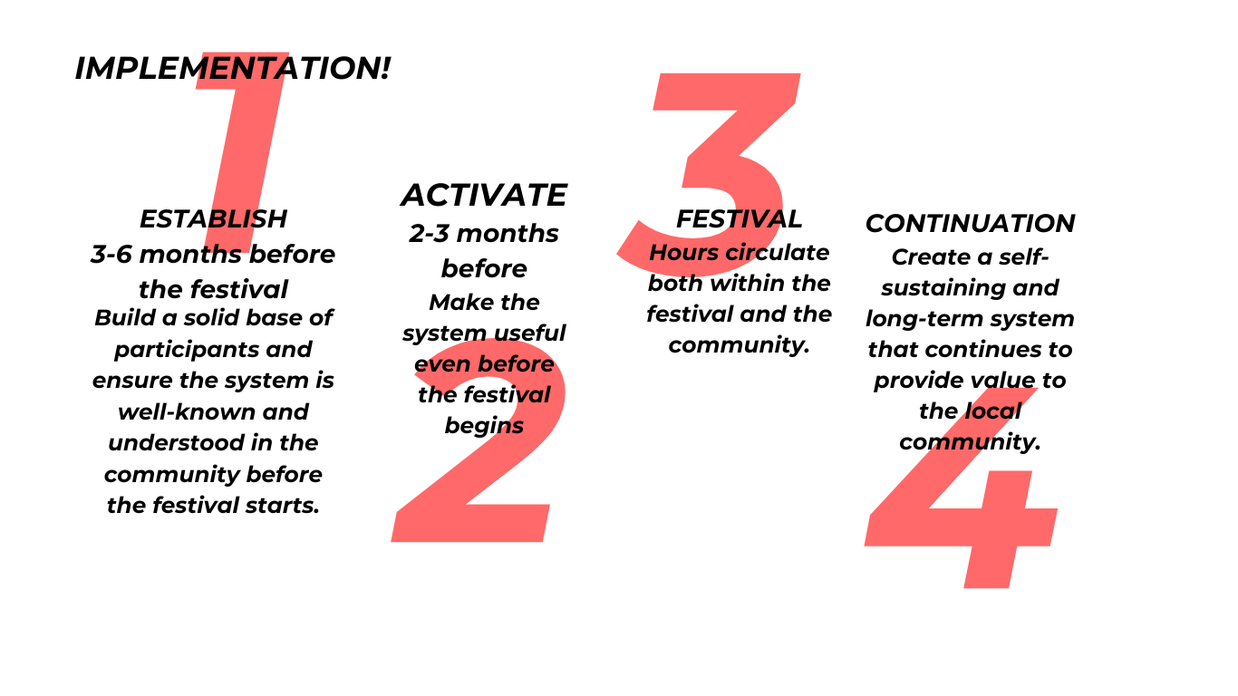 The two methods we landed in, time banking and skill sharing, was tested and practical methods for connecting a society. The festival will be a tool to implement our strategy, to introduce our own time banking software.